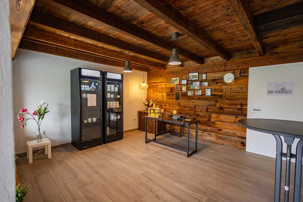 Im Hofladen können Kundinnen und Kunden die Produkte des Betriebs direkt vor Ort genießen und einkaufen – von frischen Fleisch- und Wurstspezialitäten bis hin zu herzhaften Dosenprodukten.